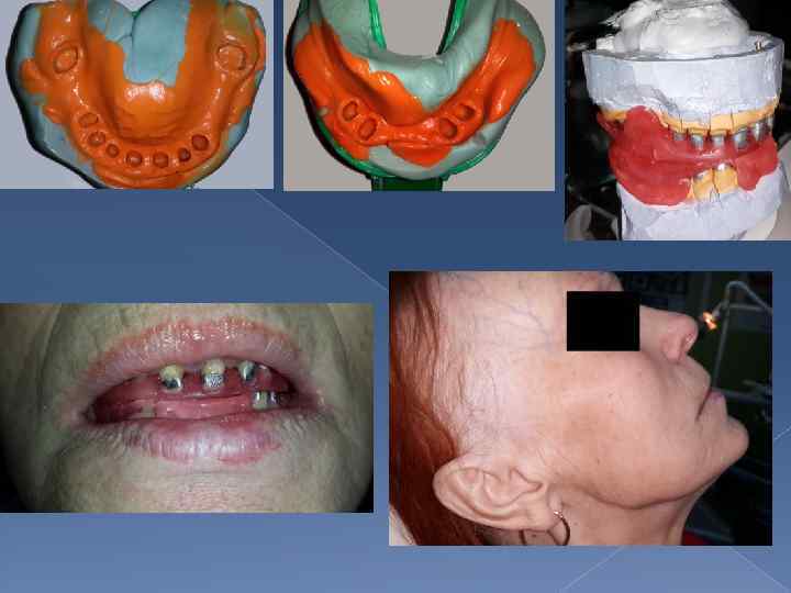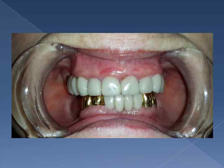 Зубная формула к ф ф к к п п к ф ф ф к 7 6 5 4 3 2 1 1 2 3 4 5 6 7 0 0 0 к п п 0 0 0 п к 0 0 0 Штампованно-паяные мостовидные протезы с опорами на зубы 1. 7, 1. 4, 1. 3; 2. 3, 2. 7, а также штампованные коронки на зубах 3. 4, 4. 4 не соответствуют клиническим требованиям. Пломбы на зубах 1. 2, 1. 1, 2. 2, 3. 3, 4. 2, 4. 3 не соответствуют клиническим требованиям. Перкуссия зубов 1. 2, 1. 1, 2. 2, 3. 3, 4. 3 безболезненна, подвижности нет. Зуб 4. 2 - перкуссия безболезненна, подвижность III степени, оголение корня на 1/3 длины, пародонтальный карман 6 мм. После снятия мостовидных протезов выявлены глубокие кариозные полости на зубах 1. 7, 1. 4, 2. 7. Альвеолярный отросток нижней челюсти (2 класс по Эльбрехту)