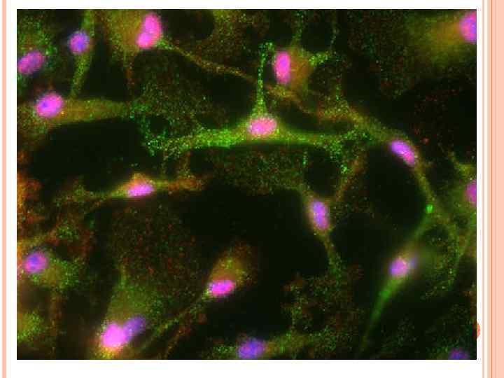 ТАНИЦИТЫ Сходны по морфологии и хим. составу с астроглией и РГ. Имеется 4 вида таницитов, которые различаются по экспрессии функциональных молекул. Тела клеток лежат в дне третьего желудочка, а отростки доходят до гипоталамуса. Возможная роль – передача информации о составе спинномозговой жидкости в ЦНС. Последние исследования показали, что танициты способны транспортировать молекулы из СМП в кровь.