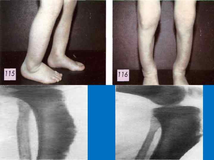 «Саблевидные голени» § В основе этого процесса лежит диффузный остеопериостит с реактивным склерозом, ведущий к утолщению периоста большой берцовой кости. § В результате длительного воздействия воспалительного процесса на эпифиз рост кости происходит более интенсивно и кость удлиняется. § Вследствие давления тяжести тела голени ребенка, уже начавшего ходить, искривляются вперёд и приобретают вид, похожий на клинок сабли.