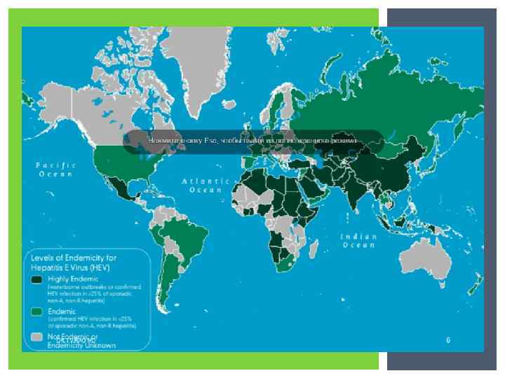 ГЕОГРАФИЧЕСКОЕ РАСПРЕДЕЛЕНИЕ Гепатит Е обнаруживается во всем мире, и различия в эпидемиологии определяются разными генотипами вируса гепатита Е. Самые высокие показатели доминирования серотипа наблюдаются в районах, где низкие уровни санитарии повышают риск передачи вируса. Более 60% всех случаев инфицирования гепатитом Е и 65% всех случаев смерти от гепатита Е происходят в Восточной и Южной Азии, где в некоторых возрастных группах показатели доминирования серотипа составляют 25%. В Египте половина населения в возрасте старше пяти лет серологически позитивна на вирус гепатита Е.