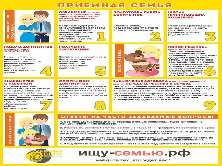 Кто может быть кандидатом в опекуны или приемные родители. В соответствии со ст. 35 Гражданского кодекса РФ, ст. 146 Семейного кодекса РФ и ст. 153 Семейного Кодекса РФ опекунамиприемными родителями могут быть совершеннолетние дееспособные лица, за исключением: -лиц, лишенных или ограниченных судом в родительских правах; -лиц, имеющих или имевших судимость, подвергающихся или подвергавшихся уголовному преследованию (за исключением лиц, уголовное преследование в отношении которых прекращено по реабилитирующим основаниям) за преступления против жизни и здоровья, свободы, чести и достоинства личности (за исключением незаконного помещения в психиатрический стационар, клеветы и оскорбления), половой неприкосновенности и половой свободы личности, против семьи и несовершеннолетних, здоровья населения и общественной нравственности, а также против общественной безопасности, мира и безопасности человечества (подробнее); -лиц, имеющих неснятую или непогашенную судимость за тяжкие или особо тяжкие преступления (подробнее); -лиц, не прошедших психолого-педагогической и правовой подготовки согласно п. 6 ст. 127 Семейного кодекса РФ.