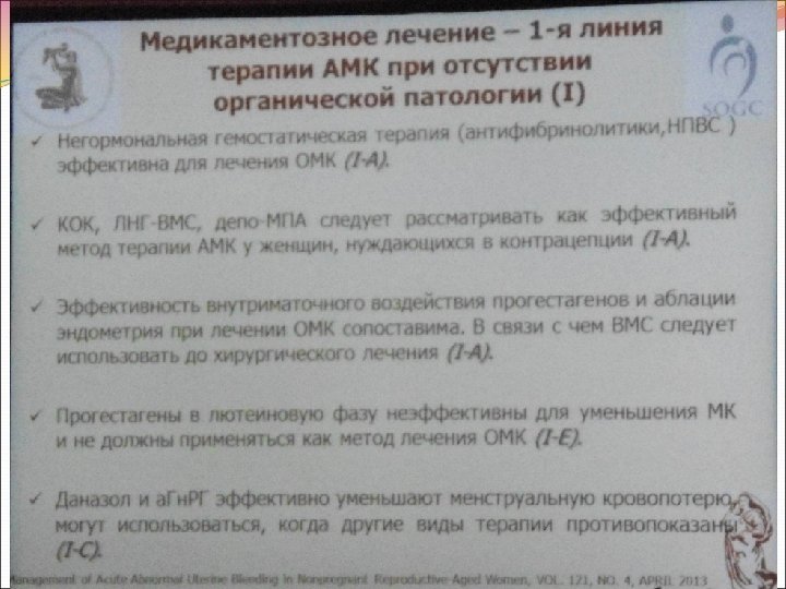 Лечение острых АМК Острое АМК- эпизод кровотечения у небеременных, который требует проведение экстренной терапии для предотвращения дальнейшей кровопотери. Транексамовая кислота каждые перорально 4 г/сут (США), 2 -3 г/сут (за пределами США) или 10 мг/кг в/в каждые 8 часов Конъюгированные эстрогены 25 мг каждые 4 -6 часов в/в Оральные эстрогены и/или КОК (ЕЕ-100 мкг/сут) 5 -7 дней с последующим уменьшением дозы МПА (60 -120 мг/сут) или мегестрол ацетат (20 -60 мг 2 раза в сутки) с уменьшением дозы и поддерживающей терапией 21 день