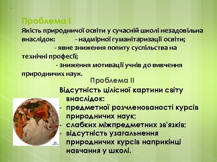 Проблема І Якість природничої освіти у сучасній школі незадовільна внаслідок: - надмірної гуманітаризації освіти; - явне зниження попиту суспільства на технічні професії; - зниження мотивації учнів до вивчення природничих наук. Проблема ІІ Відсутність цілісної картини світу внаслідок: - предметної розчленованості курсів природничих наук; - слабких міжпредметних зв'язків; - відсутність узагальнення природничих курсів наприкінці навчання у школі.