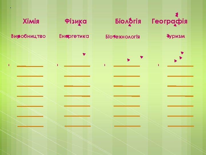 Хімія Виробництво Фізика Енергетика Біологія Біотехнологія Географія Туризм