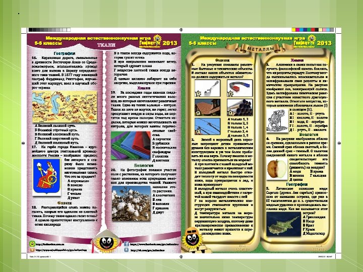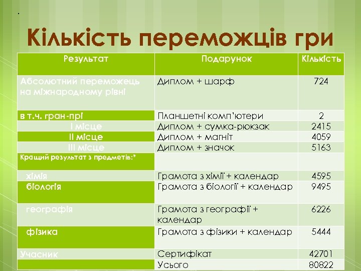 Кількість переможців гри Результат Подарунок Кількість Абсолютний переможець на міжнародному рівні Диплом + шарф 724 в т. ч. гран-прі І місце ІІІ місце Планшетні комп’ютери Диплом + сумка-рюкзак Диплом + магніт Диплом + значок 2 2415 4059 5163 хімія біологія Грамота з хімії + календар Грамота з біології + календар 4595 9495 географія Грамота з географії + календар Грамота з фізики + календар 6226 Сертифікат Усього 42701 80822 Кращий результат з предметів: * фізика Учасник 5444