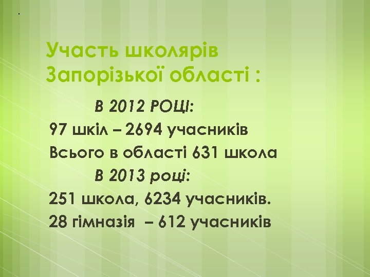 Участь школярів Запорізької області : В 2012 РОЦІ: 97 шкіл – 2694 учасників Всього в області 631 школа В 2013 році: 251 школа, 6234 учасників. 28 гімназія – 612 учасників