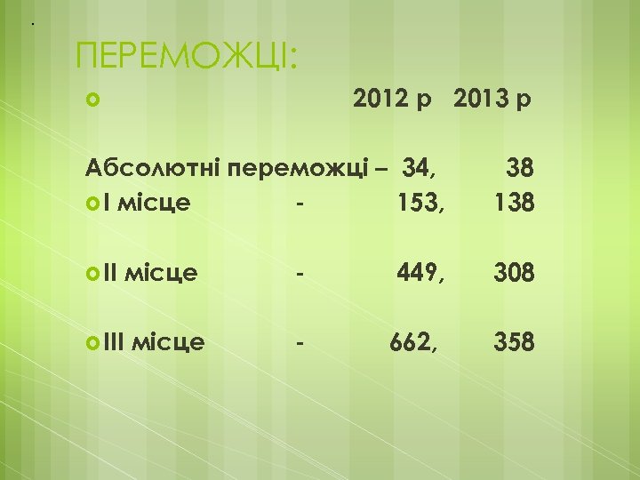 ПЕРЕМОЖЦІ: 2012 р 2013 р Абсолютні переможці – 34, І місце 153, 38 138 ІІІ місце - 449, 308 - 662, 358