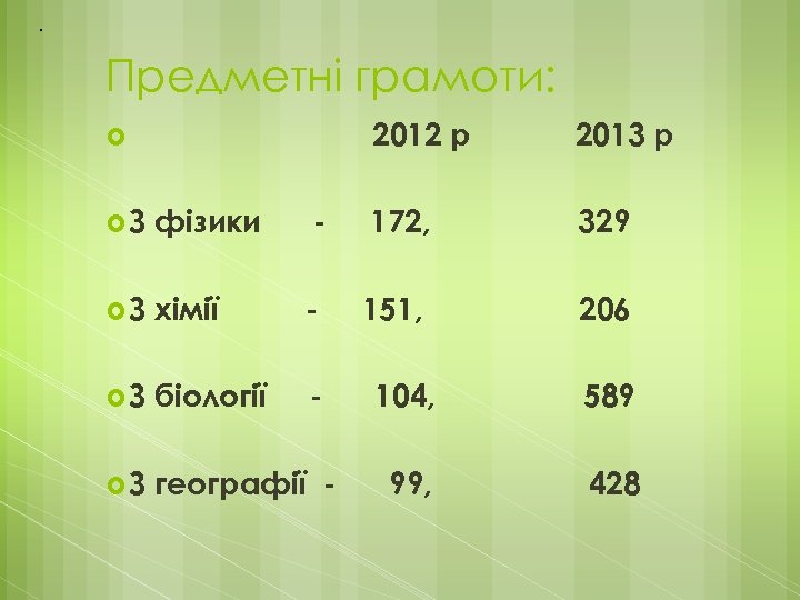 Предметні грамоти: 2012 р 2013 р З фізики - 172, 329 З хімії - 151, 206 З біології - З географії - 104, 589 99, 428