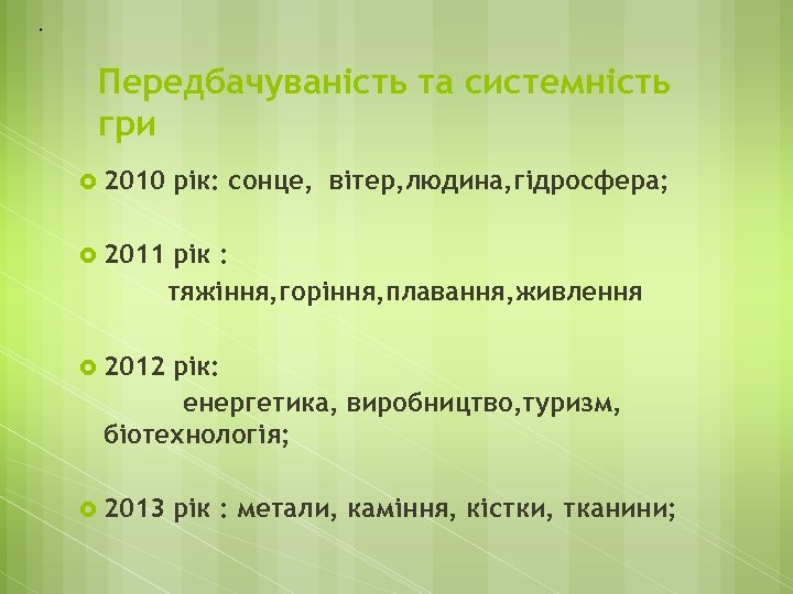 Передбачуваність та системність гри 2010 рік: сонце, вітер, людина, гідросфера; 2011 рік : тяжіння, горіння, плавання, живлення 2012 рік: енергетика, виробництво, туризм, біотехнологія; 2013 рік : метали, каміння, кістки, тканини;