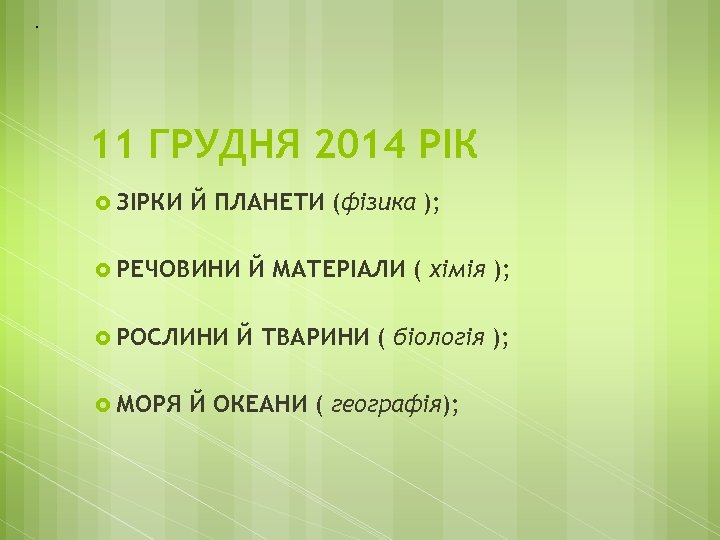 11 ГРУДНЯ 2014 РІК ЗІРКИ Й ПЛАНЕТИ (фізика ); РЕЧОВИНИ РОСЛИНИ МОРЯ Й МАТЕРІАЛИ ( хімія ); Й ТВАРИНИ ( біологія ); Й ОКЕАНИ ( географія);