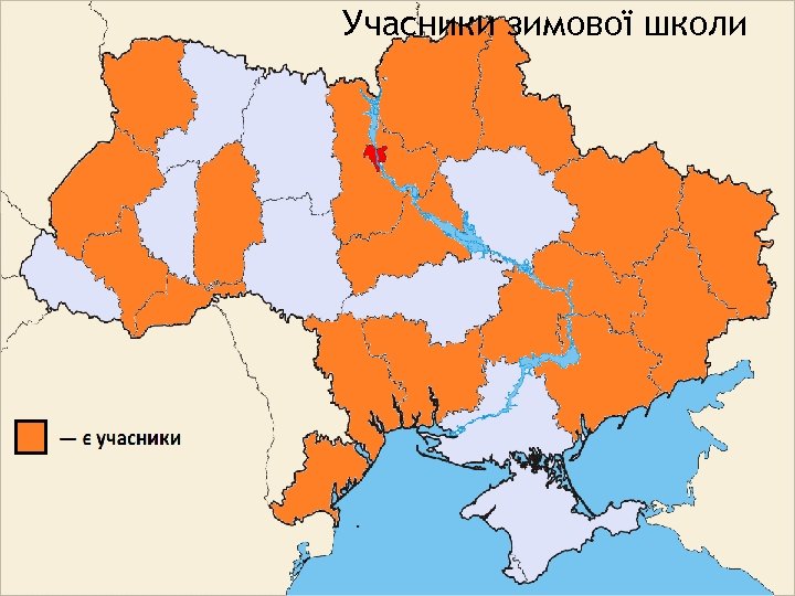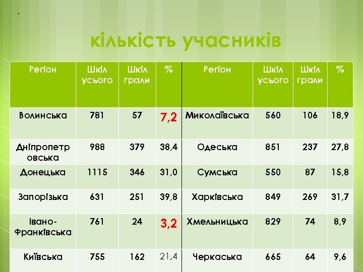 кількість учасників Регіон Шкіл усього Шкіл грали % Регіон Шкіл усього грали % Волинська 781 57 7, 2 Миколаївська 560 106 18, 9 Дніпропетр овська 988 379 38, 4 Одеська 851 237 27, 8 Донецька 1115 346 31, 0 Сумська 550 87 15, 8 Запорізька 631 251 39, 8 Харківська 849 269 31, 7 Івано. Франківська 761 24 3, 2 Хмельницька 829 74 8, 9 Київська 755 162 21, 4 Черкаська 665 64 9, 6