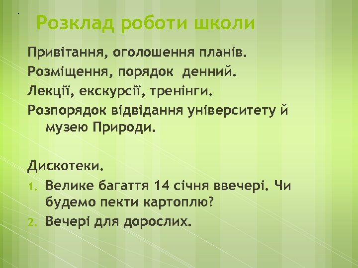 Розклад роботи школи Привітання, оголошення планів. Розміщення, порядок денний. Лекції, екскурсії, тренінги. Розпорядок відвідання університету й музею Природи. Дискотеки. 1. Велике багаття 14 січня ввечері. Чи будемо пекти картоплю? 2. Вечері для дорослих.