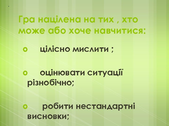Гра націлена на тих , хто може або хоче навчитися: цілісно мислити ; оцінювати ситуації різнобічно; робити нестандартні висновки;