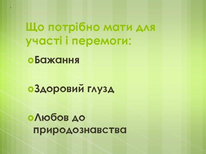 Що потрібно мати для участі і перемоги: Бажання Здоровий Любов глузд до природознавства