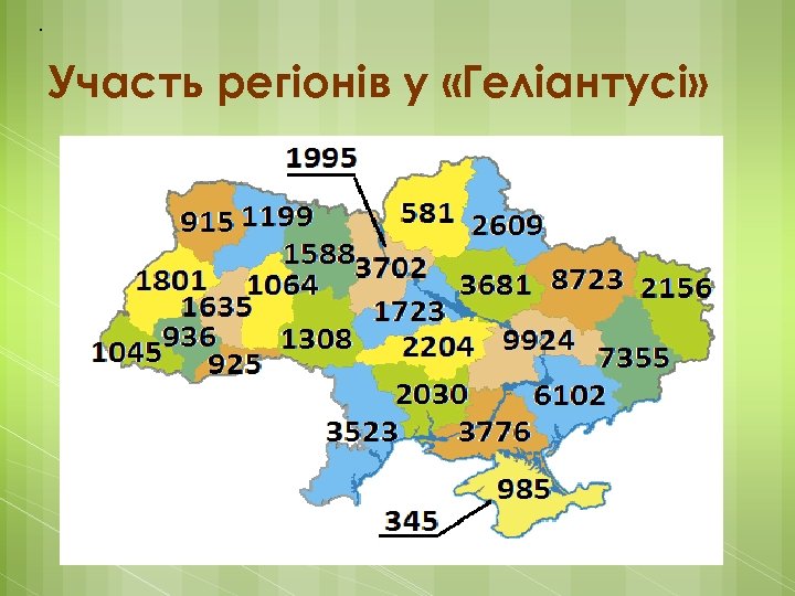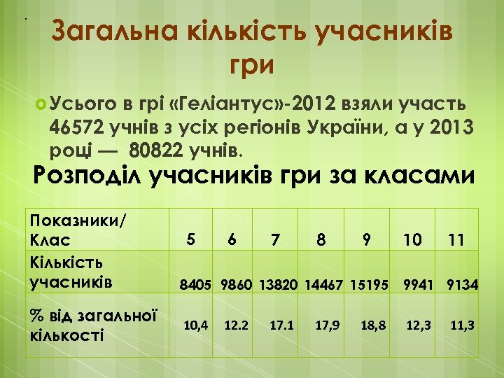 Загальна кількість учасників гри Усього в грі «Геліантус» -2012 взяли участь 46572 учнів з усіх регіонів України, а у 2013 році — 80822 учнів. Розподіл учасників гри за класами Показники/ Клас Кількість учасників % від загальної кількості 5 6 7 8 9 10 11 8405 9860 13820 14467 15195 9941 9134 10, 4 12, 3 12. 2 17. 1 17, 9 18, 8 11, 3