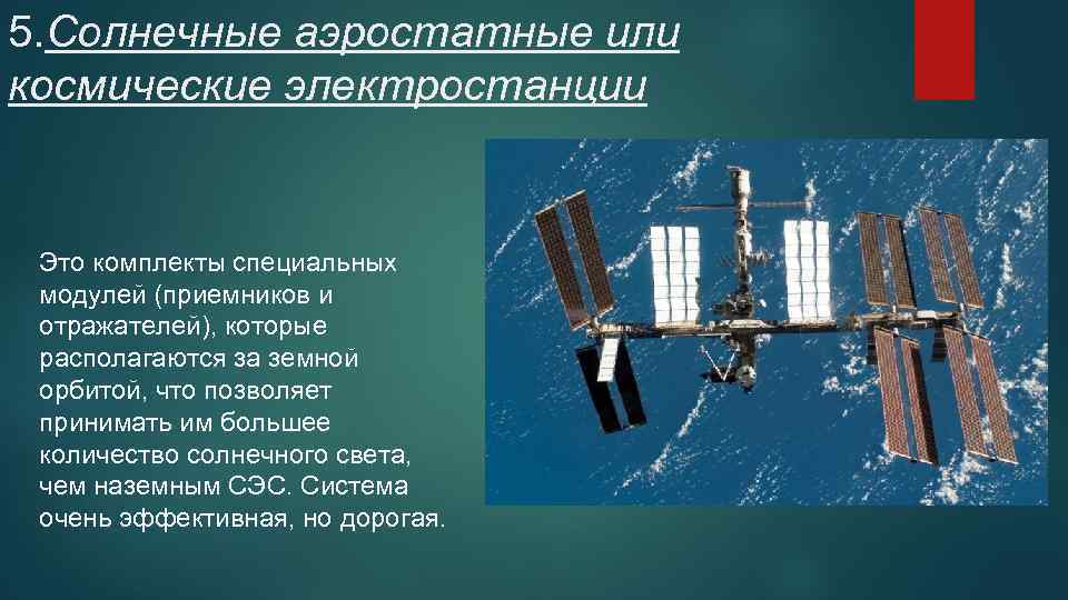 5. Солнечные аэростатные или космические электростанции Это комплекты специальных модулей (приемников и отражателей), которые располагаются за земной орбитой, что позволяет принимать им большее количество солнечного света, чем наземным СЭС. Система очень эффективная, но дорогая.