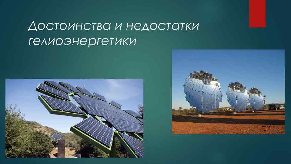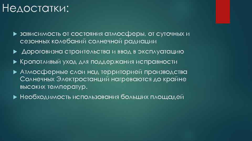 Недостатки: зависимость от состояния атмосферы, от суточных и сезонных колебаний солнечной радиации Дороговизна строительства и ввод в эксплуатацию Кропотливый уход для поддержания исправности Атмосферные слои над территорией производства Солнечных Электростанций нагреваются до крайне высоких температур. Необходимость использования больших площадей