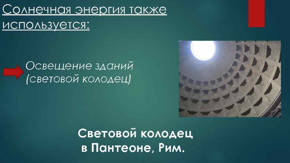 Солнечная энергия также используется: Освещение зданий (световой колодец) Световой колодец в Пантеоне, Рим.