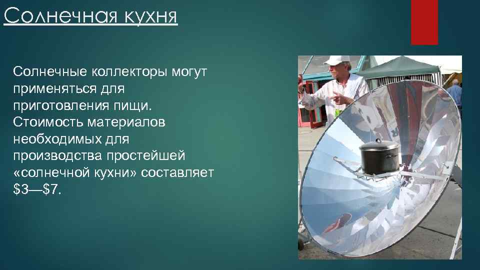 Солнечная кухня Солнечные коллекторы могут применяться для приготовления пищи. Стоимость материалов необходимых для производства простейшей «солнечной кухни» составляет $3—$7.