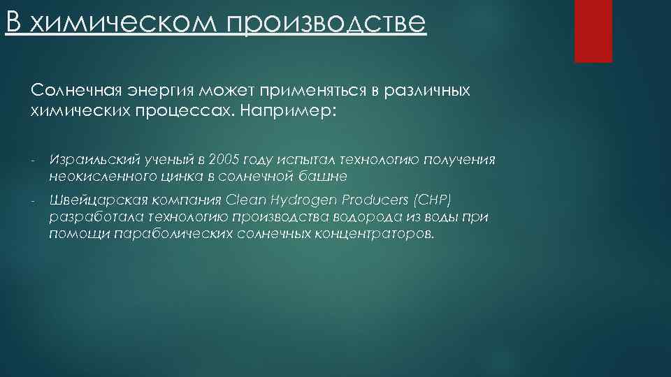 В химическом производстве Солнечная энергия может применяться в различных химических процессах. Например: - Израильский ученый в 2005 году испытал технологию получения неокисленного цинка в солнечной башне - Швейцарская компания Clean Hydrogen Producers (CHP) разработала технологию производства водорода из воды при помощи параболических солнечных концентраторов.