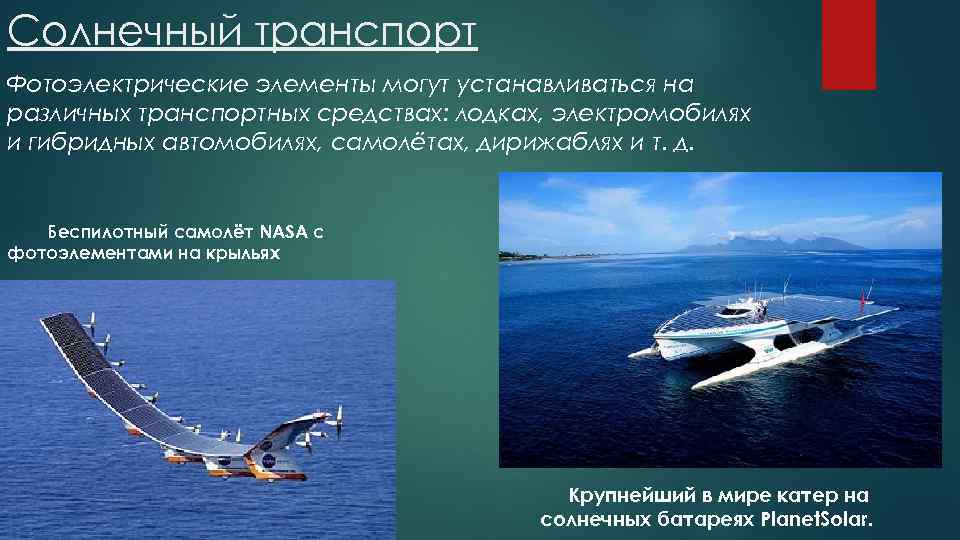 Солнечный транспорт Фотоэлектрические элементы могут устанавливаться на различных транспортных средствах: лодках, электромобилях и гибридных автомобилях, самолётах, дирижаблях и т. д. Беспилотный самолёт NASA с фотоэлементами на крыльях Крупнейший в мире катер на солнечных батареях Planet. Solar.