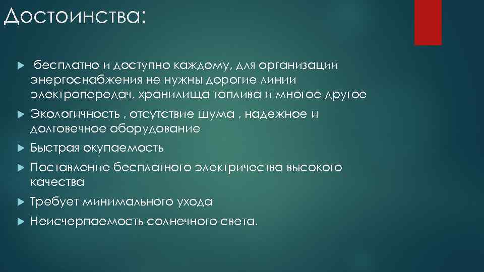 Достоинства: бесплатно и доступно каждому, для организации энергоснабжения не нужны дорогие линии электропередач, хранилища топлива и многое другое Экологичность , отсутствие шума , надежное и долговечное оборудование Быстрая окупаемость Поставление бесплатного электричества высокого качества Требует минимального ухода Неисчерпаемость солнечного света.