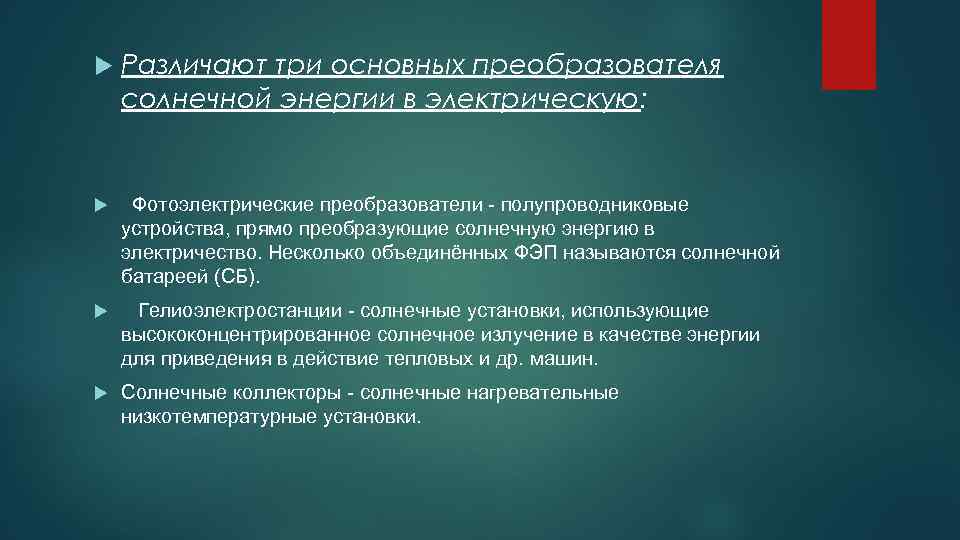 Различают три основных преобразователя солнечной энергии в электрическую: Фотоэлектрические преобразователи - полупроводниковые устройства, прямо преобразующие солнечную энергию в электричество. Несколько объединённых ФЭП называются солнечной батареей (СБ). Гелиоэлектростанции - солнечные установки, использующие высококонцентрированное солнечное излучение в качестве энергии для приведения в действие тепловых и др. машин. Солнечные коллекторы - солнечные нагревательные низкотемпературные установки.