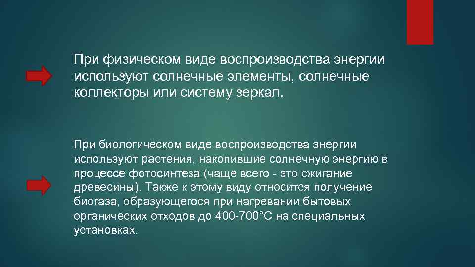При физическом виде воспроизводства энергии используют солнечные элементы, солнечные коллекторы или систему зеркал. При биологическом виде воспроизводства энергии используют растения, накопившие солнечную энергию в процессе фотосинтеза (чаще всего - это сжигание древесины). Также к этому виду относится получение биогаза, образующегося при нагревании бытовых органических отходов до 400 -700°С на специальных установках.