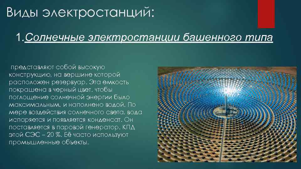 Виды электростанций: 1. Солнечные электростанции башенного типа представляют собой высокую конструкцию, на вершине которой расположен резервуар. Эта емкость покрашена в черный цвет, чтобы поглощение солнечной энергии было максимальным, и наполнено водой. По мере воздействия солнечного света, вода испаряется и появляется конденсат. Он поставляется в паровой генератор. КПД этой СЭС – 20 %. Её часто используют промышленные объекты.