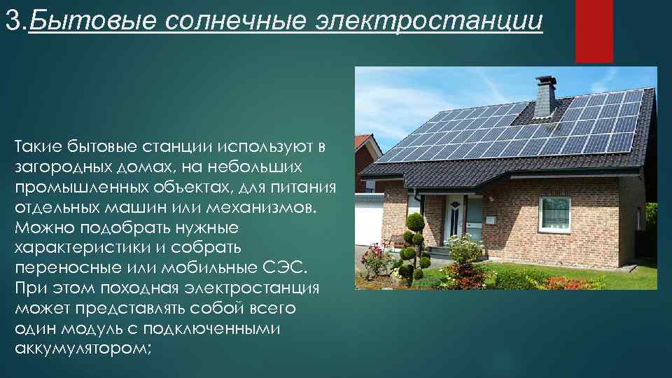 3. Бытовые солнечные электростанции Такие бытовые станции используют в загородных домах, на небольших промышленных объектах, для питания отдельных машин или механизмов. Можно подобрать нужные характеристики и собрать переносные или мобильные СЭС. При этом походная электростанция может представлять собой всего один модуль с подключенными аккумулятором;