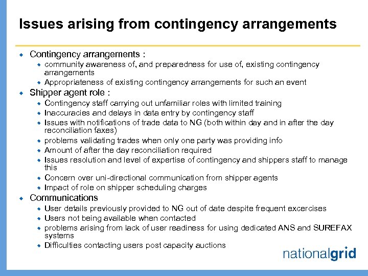 Issues arising from contingency arrangements ® Contingency arrangements : ® ® ® Shipper agent role : ® ® ® ® ® community awareness of, and preparedness for use of, existing contingency arrangements Appropriateness of existing contingency arrangements for such an event Contingency staff carrying out unfamiliar roles with limited training Inaccuracies and delays in data entry by contingency staff Issues with notifications of trade data to NG (both within day and in after the day reconciliation faxes) problems validating trades when only one party was providing info Amount of after the day reconciliation required Issues resolution and level of expertise of contingency and shippers staff to manage this Concern over uni-directional communication from shipper agents Impact of role on shipper scheduling charges Communications ® ® User details previously provided to NG out of date despite frequent excercises Users not being available when contacted problems arising from lack of user readiness for using dedicated ANS and SUREFAX systems Difficulties contacting users post capacity auctions