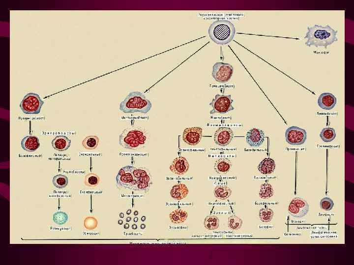Патогенез гемобластозов • Гемобластозы – заболевания опухолевой природы • Это результат соматической мутации кроветворной клетки, которая, размножаясь, образует потомство себе подобных клеток (клон) • Дальнейшее распространение процесса происходит путем переноса (метастазирования) этих клеток по кровеносной системе • Все гемобластозы происходят из клеток 2 -го или 3 го класса схемы кроветворения. Следовательно, родоначальниками опухолевого процесса могут быть клетка-предшественник миелопоэза или лимфопоэза, реже- унипотентная клетка-предшественник