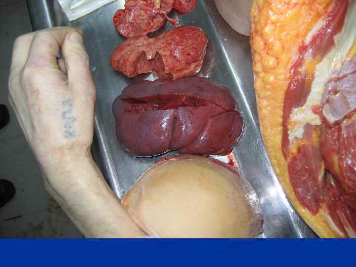 ПАТОЛОГОАНАТОМИЧЕСКИЙ ДИАГНОЗ Осн: Острый, недифференцированный, бластный лейкоз с лейкемическими инфильтратами в кроветворной ткани тел поясничных позвонков, сердечной мышце, мягкой мозговой оболочке полушарий головного мозга, печени (масса 2150 г), почках (масса 450 г. ), надпочечниках, поджелудочной железе, слизистой оболочке желудочно-кишечного тракта, лимфатических узлах и селезенке (масса 600 г. ) Осл: Септицемия (13. 2. 6 г. из крови выделен Str. pneumoniae). Эрозивно-язвенный эзофагит, гастрит, энтерит, колит. Точечные и пятнистые кровоизлияния в коже, слизистых и серозных оболочках. Выраженное малокровие и дистрофия внутренних органов. Отек легких и головного мозга. Сопутствующие: ИБС. Диффузный кардиосклероз. Стенозирующий, примерно на 1/3 атеросклероз коронарных артерий сердца. ЦВБ. Кисты в сером и белом веществе головного мозга. Стенозирующий, примерно на 1/3 атеросклероз сосудов головного мозга. Аденоматозная гиперплазия предстательной железы.
