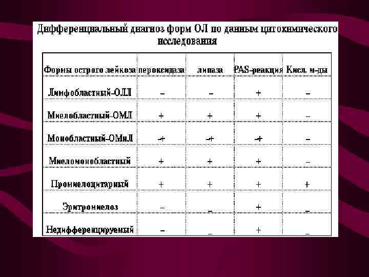 ОЛ формы, их дифференциальный диагноз Выделяют различные формы ОЛ, морфологически они дифференцируются с большим трудом, поэтому бластные клетки изучаются с помошью гистохимических реакций, которые позволяют в большинстве случаев точно установить форму ОЛ. Это крайне важно с практической точки зрения, поскольку программы радикального лечения напрямую зависят от формы лейкоза.