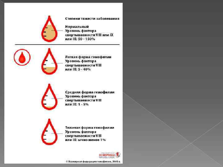 Степень тяжесть заболевания. Согласно данным ВООЗ, для гемофилии А/В существует три степени тяжести заболевания: • тяжелая: уровень фактора VІІІ(ІX) не превышает 0, 1%; • средней тяжести: уровень фактора VІІІ(ІX) от 1% до 5% • легкая: уровень фактора VІІІ(ІX) от 5% до 30% В норме активность фактора VІІІ или ІX составляет от 50% до 100%.
