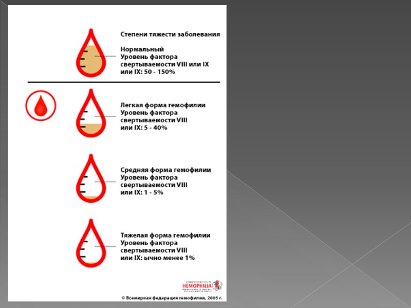 Степень тяжесть заболевания. Согласно данным ВООЗ, для гемофилии А/В существует три степени тяжести заболевания: • тяжелая: уровень фактора VІІІ(ІX) не превышает 0,1%; • средней тяжести: уровень фактора VІІІ(ІX) от 1% до 5% • легкая: уровень фактора VІІІ(ІX) от 5% до 30% В норме активность фактора VІІІ или ІX составляет от 50% до 100%.