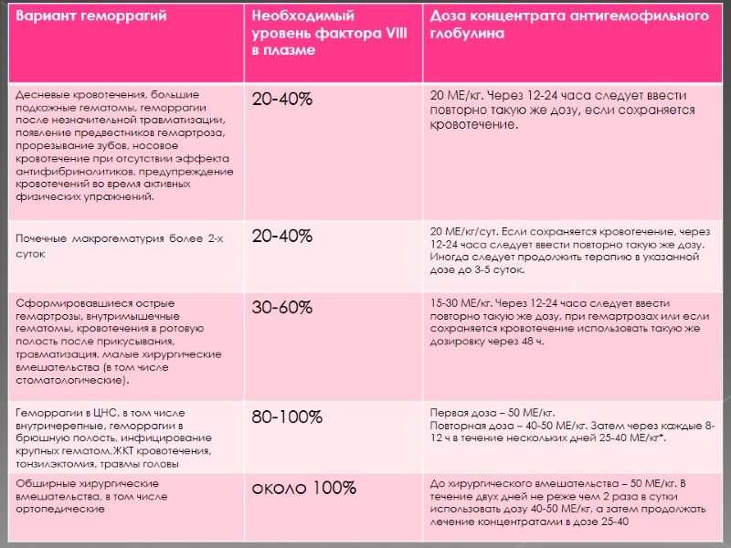 Профилактическое лечение Введение концентрата фактора VIII 3 раза в неделю в дозе 20-40 МЕ/кг (25 МЕ/кг).