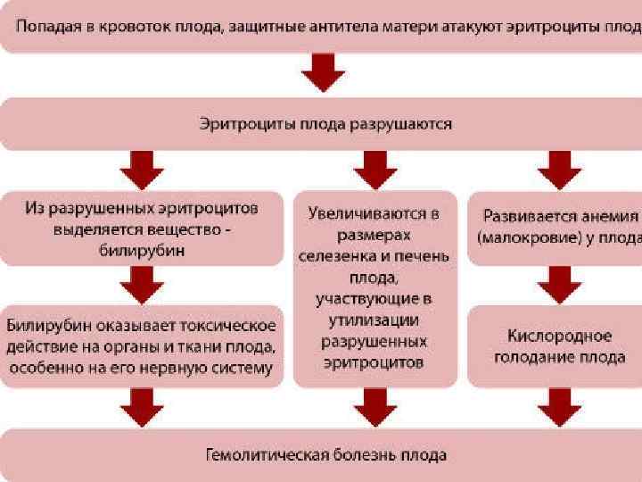 Патогенез При несоответствии крови матери и плода в организме беременной женщины вырабатываются антитела, которые затем проникают во время беременности через плацентарный барьер в кровь плода и вызывают разрушение (гемолиз) его эритроцитов. В результате усиленного гемолиза происходит нарушение билирубинового обмена. Возможны следующие варианты проникновения антител через плаценту: v во время беременности, что приводит к врожденным формам ГБН (рождение мацерированных плодов, отечная, анемическая, желтушная формы); v во время родов, что ведет к развитию послеродовой желтушной формы; Антирезус-антитела образуются у 3 -5 % женщин с резус-отрицательной кровью при беременности плодом с резус-положительной кровью. Гемолитическая болезнь новорожденных проявляется в 3 основных формах: анемической, желтушной, отечной.