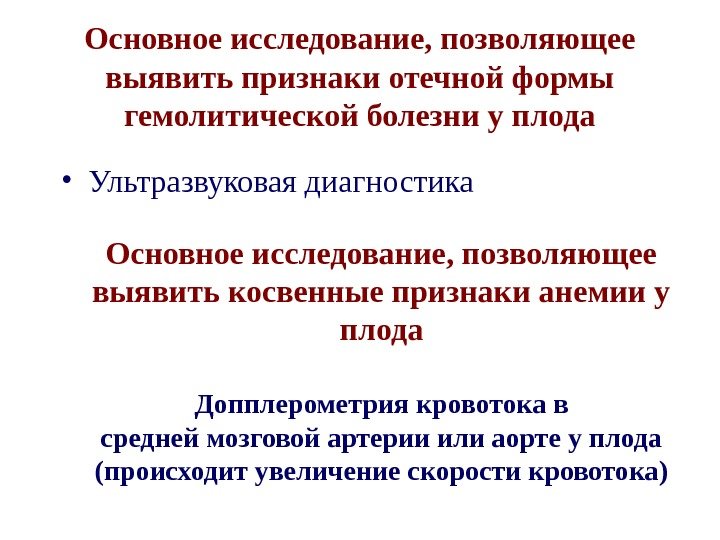 Основное исследование, позволяющее выявить признаки отечной формы гемолитической болезни у плода • Ультразвуковая диагностика Основное исследование, позволяющее выявить косвенные признаки анемии у плода Допплерометрия кровотока в средней мозговой артерии или аорте у плода (происходит увеличение скорости кровотока)