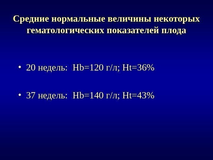 • 20 недель: Hb=120 г / л; Ht=36 % • 37 недель: Hb=140 г / л; Ht=43%Средние нормальные величины некоторых гематологических показателей плода