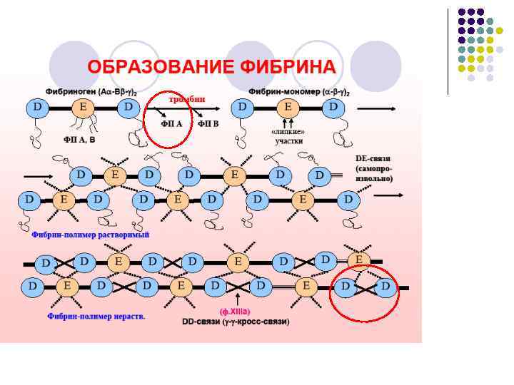 ОЦЕНКА ФИБРИНОЛИЗА l l l Время лизиса эуглобулинового сгустка /ХIIа зависимый фибринолиз является важнейшим базисным методом исследования системы фибринолиза, позволяющим оценить состояние внутреннего и внешнего механизмов образования плазминогена. l Усиление общей фибринолитичской активности плазмы может наблюдаться в начальной стадии ДВС, снижение фибринолиза – на поздних стадиях. Определение активности плазминогена. Комплексы плазмин-антиплазмин (ПАП) – повышаются при активации фибринолиза Продукты деградации фибрина/фибриногена - ПДФ(Ф) повышаются в плазме при активации фибринолиза в ответ на тромбообразование. l Продукты деградации фибриногена/фибрина и D-димер являются маркёрами плазминемии. Д-димеры - специфические продукты фибринолиза (показатель того, что в процессе фибринолиза расщепляется именно фибрин, а не фибриноген или фибрин-мономеры) повышаются при лизисе сгустка крови (любого!) (максимум у здорового - 250 – 500 нг/мл): l тромбоз, ДВС, состояние после операции или травмы, в ряде случаев, при сепсисе или инфекционном заболевании. l Концентрация D-димеров в сыворотке пропорциональна активности фибринолиза и количеству лизируемого фибрина.