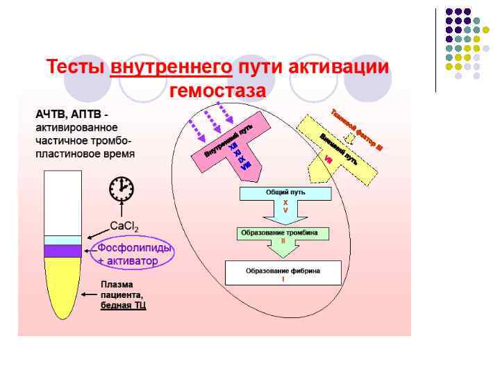 ОЦЕНКА ПЛАЗМЕННОГО ГЕМОСТАЗА l Активированное частичное (парциальное) тромбопластиновое время (АЧТВ, АПТВ) отражает активность факторов внутреннего и общего пути Ø Выражается в секундах. Ø Выражается в нормализованном отношении (норма 0, 85 – 1, 15) l l l Удлиняется при снижении активности ф. XII, XI, IX, VIII, V, X, II (I – при значительном снижении концентрации), прекалликреина (ПК), высокомолекулярного кининогена (ВМК) Удлиняется при появлении волчаночного антикоагулянта (при использовании чувствительных реактивов) Используется для контроля терапии нефракционированным гепарином