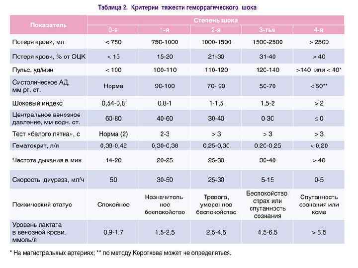 Причинами геморрагического шока в акушерстве являются потеря более 1000 мл крови, или >15% ОЦК, или >1, 5% от массы тела. Угрожающими жизни кровотечениями считаются: потеря 100% ОЦК в течение 24 часов или 50% ОЦК за 3 часа; кровопотеря со скоростью 150 мл/мин или 1, 5 мл/кг/мин. одномоментная кровопотеря >1500 — 2000 мл (25— 35% ОЦК).