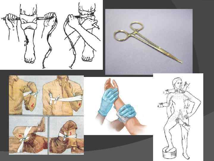 Временная остановка. Придание поврежденной части тела возвышенного положения по отношению к сердцу 2. Пальцевое прижатие поврежденной артерии на протяжении 3. Прижатие кровоточащего сосуда пальцем в ране 4. Наложение давящей повязки 5. Наложение жгута 6. Наложение жгута-закрутки 7. Тугая тампонада раны 8. Метод максимального сгибания конечности 9. Наложение кровоостанавливающего зажима 10. Применение холода и лекарственных средств с гемостатическими свойствами СОЧЕТАНИЕ! 1.