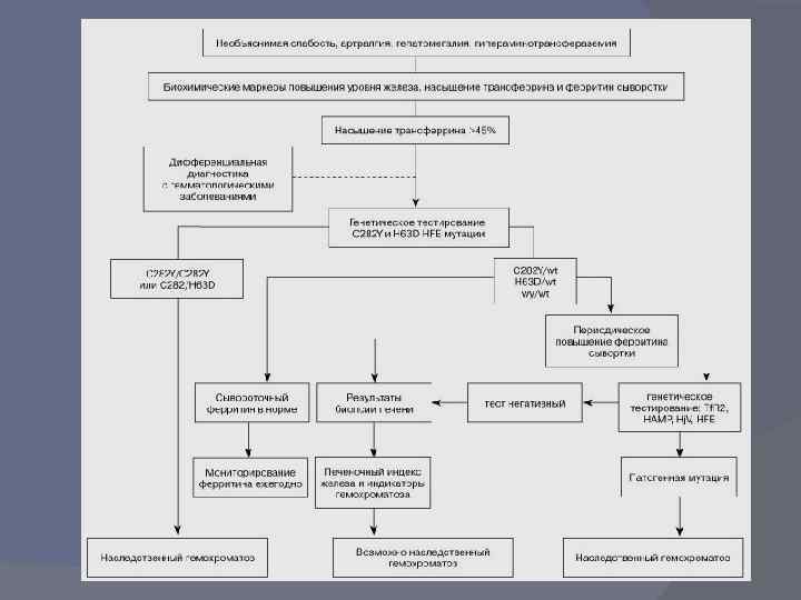 Лабораторные показатели: ○ Увеличение содержания железа сыворотки крови ○ ○ до 54 -72 мкмоль/л. (N=8, 95 - 30, 43 мкмоль/л для мужчин; 11, 64 - 30, 43 мкмоль/л - для женщин) Увеличение содержания ферритина - более 900 мкг/л. (N=80 -200 мкг/ л для мужчин; 40 -80 мкг/л для женщин) Снижение общей железосвязывающей способности сыворотки менее 40 мкмоль/л. (N=44, 8 -76, 1 мкмоль/л) Снижение содержания трансферрина сыворотки крови менее 2, 6 г/л. (N=у мужчин - 2, 15 -3, 65 г/л; у женщин - 2, 5 -3, 8 г/л) Повышение коэффициента насыщения трансферрина железом более 60% (является неинвазивным информативным скрининговым тестом на наличие перегрузки железом). (N=25 -