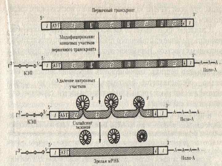 Ⅱэтап. Процессинг (созревание) Вырезка интронов идет при помощи ферментов – рестриктаз. При помощи других ферментов – лигаз – идёт сшивание экзонных участков (сплайсинг).
