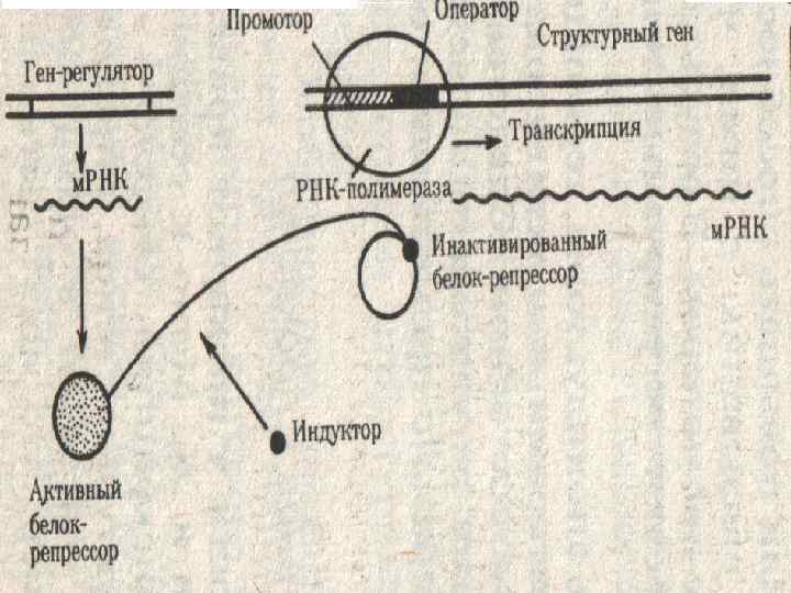 Как выяснили Жакоб и Моно, работой оперона управляют ГЕНЫ-РЕГУЛЯТОРЫ. Генырегуляторы управляют работой структурных генов через белкирепрессоры.