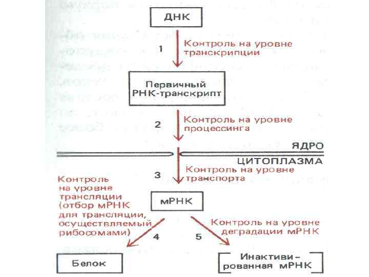 Этапы экспрессии генетической информации В 1958 году Ф. Крик сформулировал центральную догму молекулярной биологии. Она показывает план потока информации в клетке ДНК РНК белок признак Затем эта формула была дополнена: ДНК РНК белок признак Этот поток включает у эукариот 6 процессов: • репликацию ДНК • транскрипцию • обратную транскрипцию • процессинг и сплайсинг РНК • трансляцию • процессинг белка