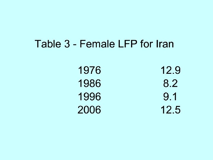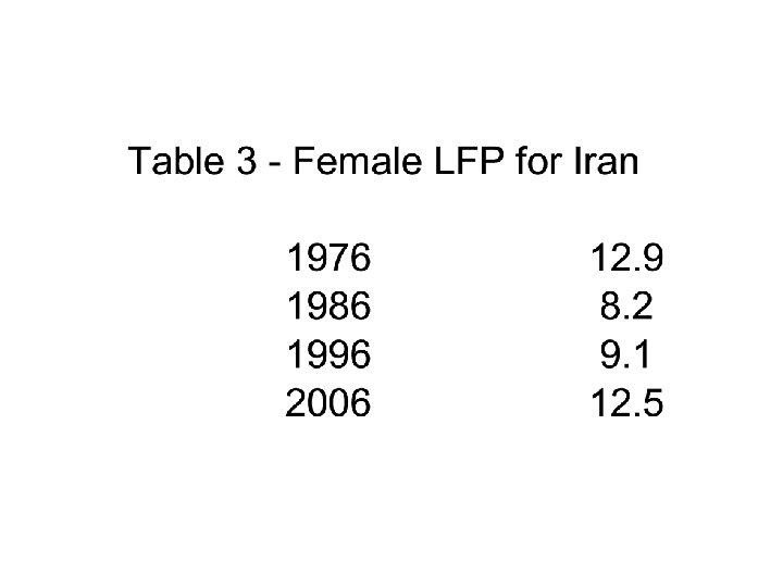 Iran 1976 -2006 • 1979 marks revolution but also imposition of sanctions • Torbat (2005) annual reduction of 1. 1% to GDP – Impact on carpet sector much more dramatic – Reduced to 1/3 of its former size • Female Labor Force Participation dropped after revolution and then rose.