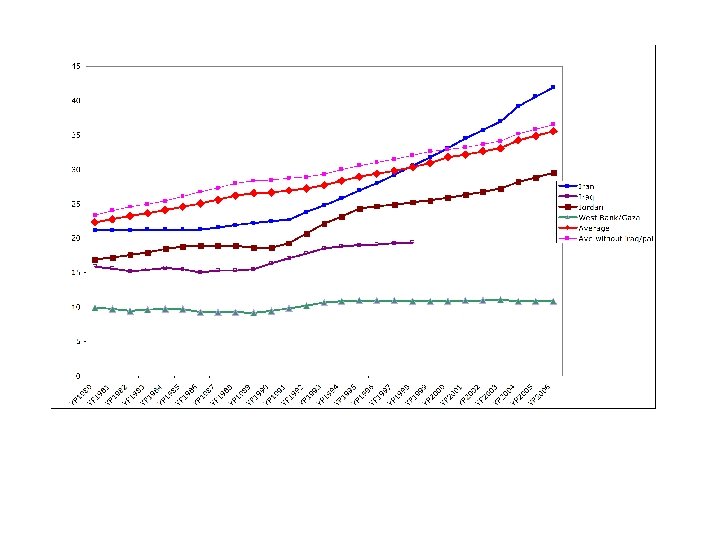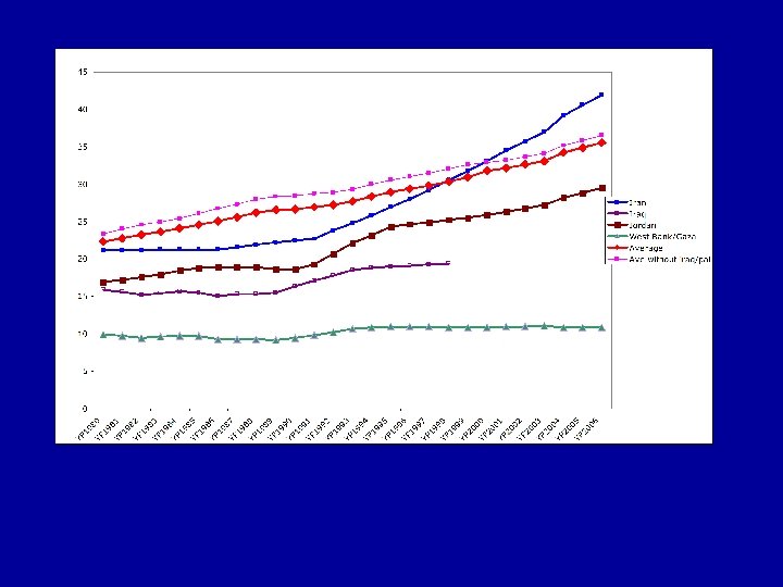 Palestinian case: • Palestinian situation is unique/tragic due to ability of Israel to control borders and impose closures. • Since 1990 s unemployment rates in the 20 to 30 percent range – loss of jobs in Israel and restrictions on local economy. • Results of extreme economic hardship – Rapidly increasing poverty (from 25 to 60% in 3 years) – Return to subsistence agriculture – Massive decline in manufacturing sector